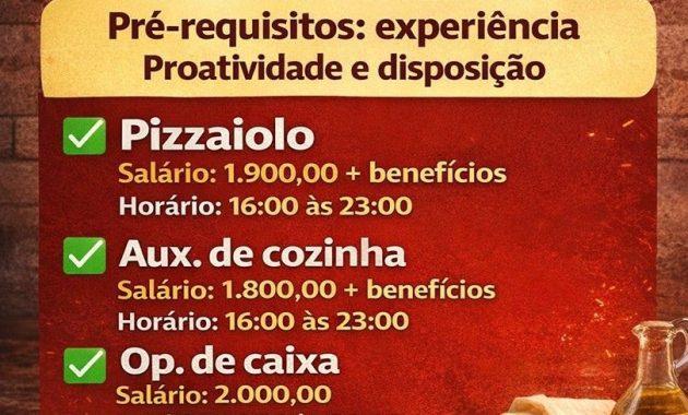 Pizzaria está selecionando Pizzaiolo, Auxiliar de cozinha, Op. de caixa; Envie seu currículo!