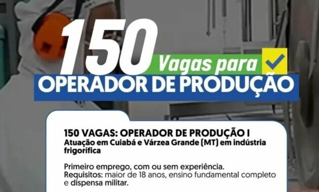 150 VAGAS: OPERADOR DE PRODUÇÃO I Atuação em Cuiabá e Várzea Grande (MT) em indústria frigorífica